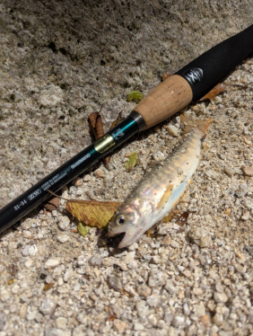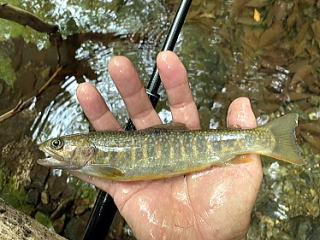 |  |  |  | 今日は昨夜の少しの雨で、朝方は水量が回復してました。イワナも活性が良く、ルアーにも好反応でした。一瞬ですがやっぱり雨が降ると違いますね。もっと降ると良いのですが。