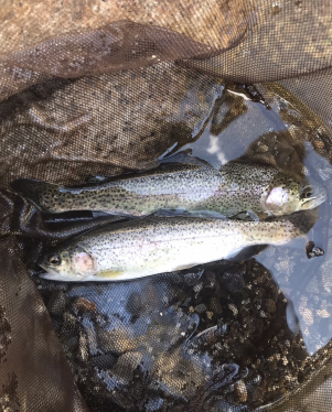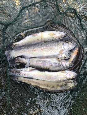 |  |  |  | 今日も晴れて減水で釣りにくい中、皆さん頑張って竿を出されていました。渓流は、やや小ぶりのイワナですが、毛鉤に好反応でした。明日は雨の予報が出ています。期待したいですね。